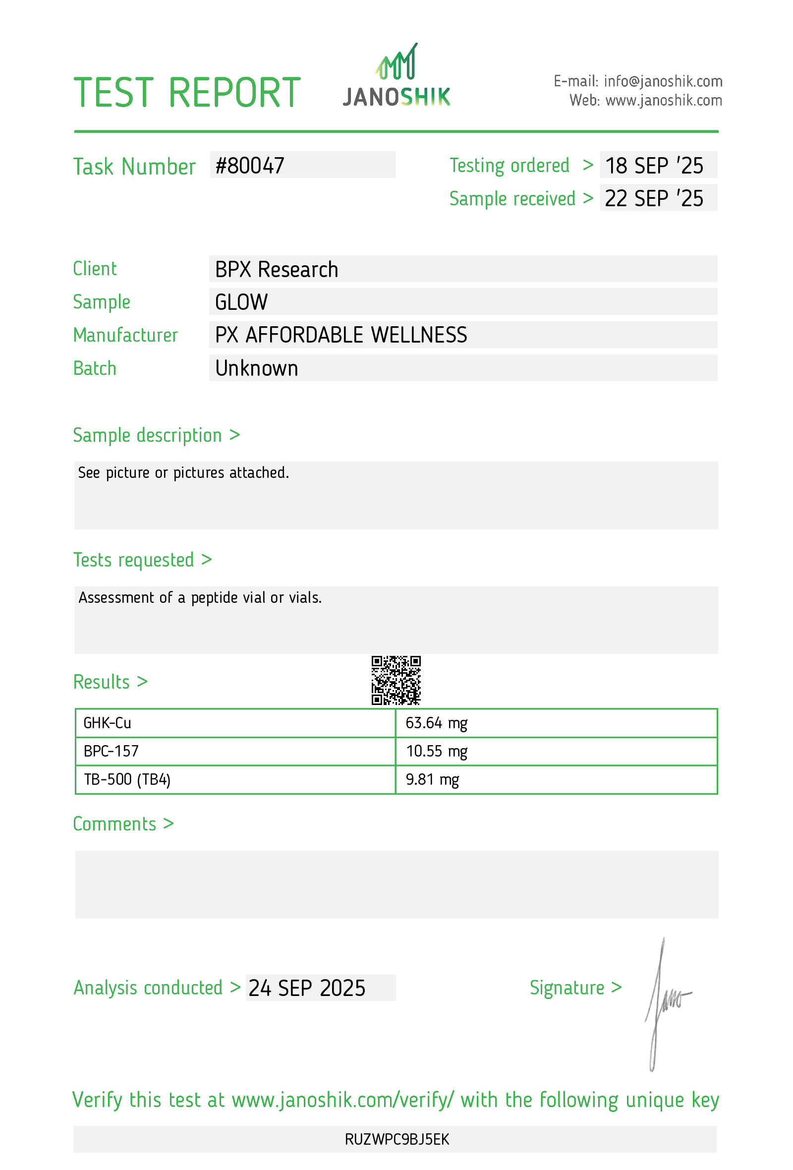 Glow Blend – in lyophilized powder form. All of our products require bacteriostatic water to reconstitute from solid to liquid form